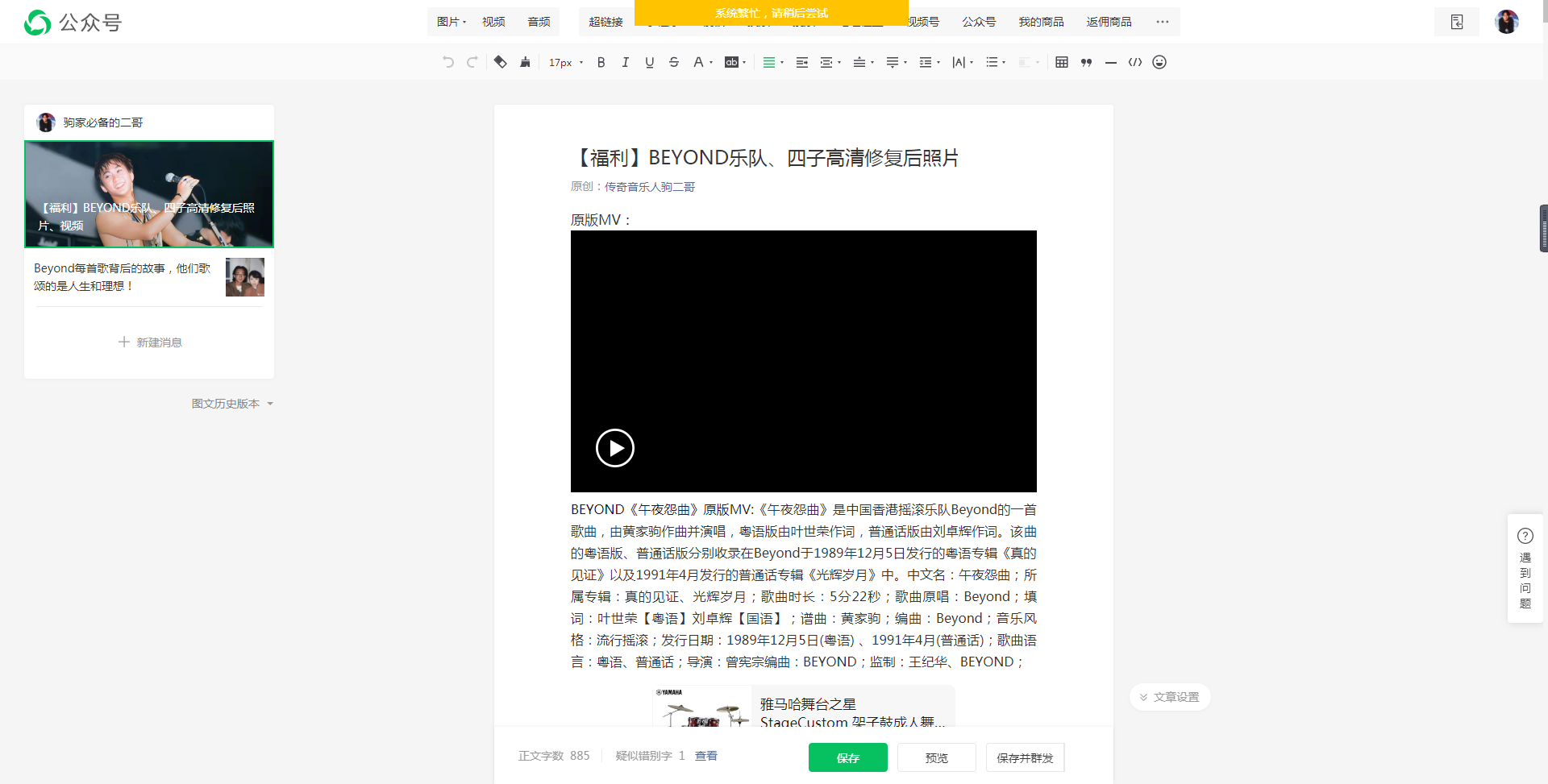 从8月20日至今天16时,公众号文章群发一直有异常,20日时编辑的8条文章,在扫描群发二维码确认群发后,页面上方提示系统繁忙,稍后重试字样,其后,8月21日正常群发,8月22日时编辑文章后,却依旧无法群发,就连两条文章也无法正常群发,依旧提示系统繁忙,稍后重试字样,将问题提交腾讯客服后一直没有回复,请核查具体原因