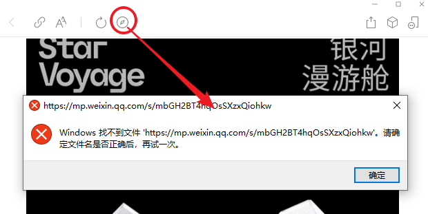 然后打开链接或者公众号文章后,点击顶部的用默认浏览器打开,也不能打开了。弹出这个。