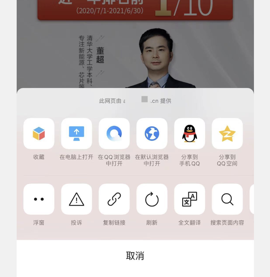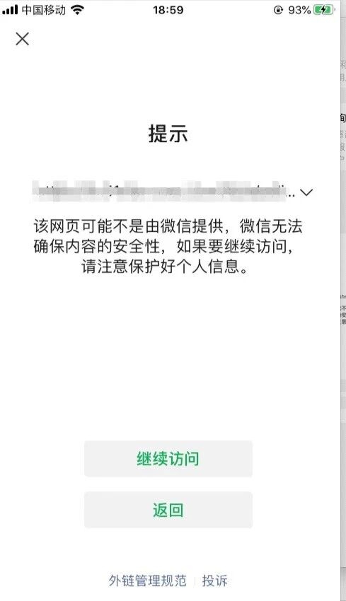 点击聊天记录里的链接会出现安全提示,点继续访问之后,点击右上角...弹出的菜单里就没有分享按钮;