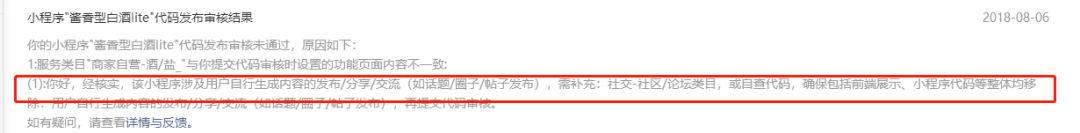 你好,经核实,小程序存在用户UGC内容的发布与交流,请自查、处理相关违规内容,确保包括前端展示、小程序代码等整体均没有违规内容。请将相关前端展示、相关代码等均完整去除后,再提交代码审核。