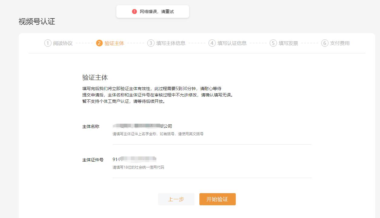 您好!紧急! 问题描述:今年只认证过一次,现在需要重新认证,原来认证的主体已删除,重新走流程一直显示““网络错误,请重试”” 请问这是怎么回事呢?我的电脑网络是没问题的,尝试过QQ浏览器、谷歌浏览器认证都出现同样的问题,我们要在这两天内完成认证,希望能尽快解决问题,谢谢!