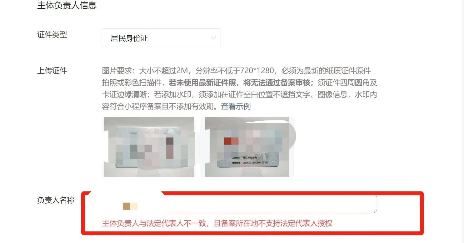 小程序备案显示:主体负责人与法定代表人不一致,且备案所在地不支持法定代表人授权