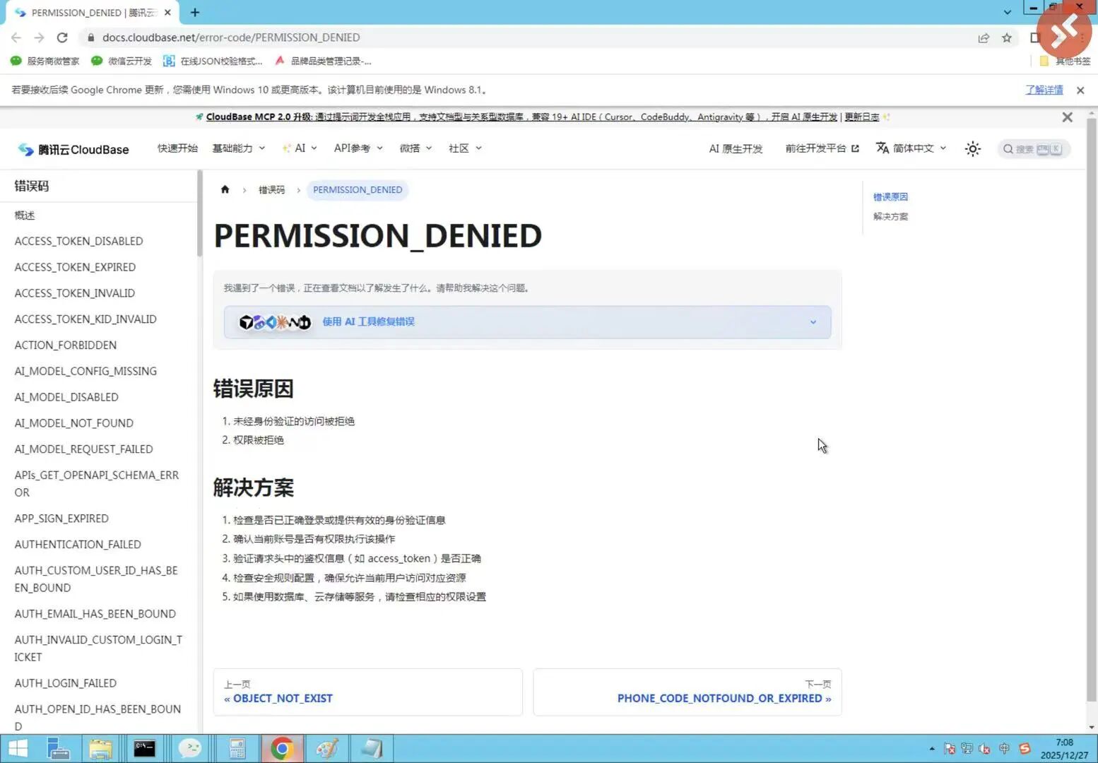 错误信息见截图,相关链接为:https://docs.cloudbase.net/error-code/PERMISSION_DENIED
