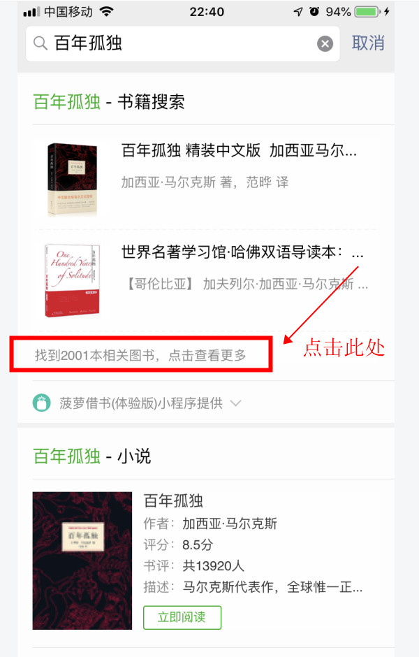 搜索“百年孤独”,有搜索结果出来,但是点击查看更多,iPhone打不开,提示页面不存在。但是安卓手机可以点击打开,正常。
