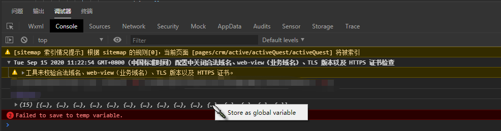 在开发者工具升级到现在最新的版本(1.03.2008270)后,如下图操作,就会报错“Failed to save to temp variable”,之前的版本一直都没有问题的,这个问题已经发过一次了,迟迟没得到回复,请官方予以重视~