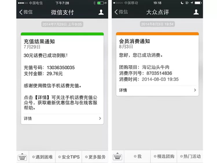 模板消息仅用于公众号向用户发送重要的服务通知,只能用于符合其要求的服务场景中,如信用卡刷卡通知,商品购买成功通知等。不支持广告等营销类消息以及其它所有可能对用户造成骚扰的消息。