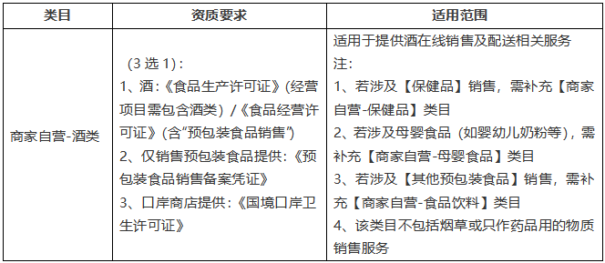 一、在商家自营形态中,服务内容提供酒类商品销售时,类目选择与适用范围如下: