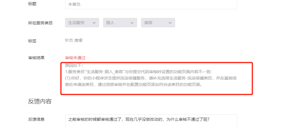 之前审核的时候都审核通过了,现在几乎没做改动的,为什么审核不通过了呢?想请问一下,服务类目具体与哪些功能页面不一致?