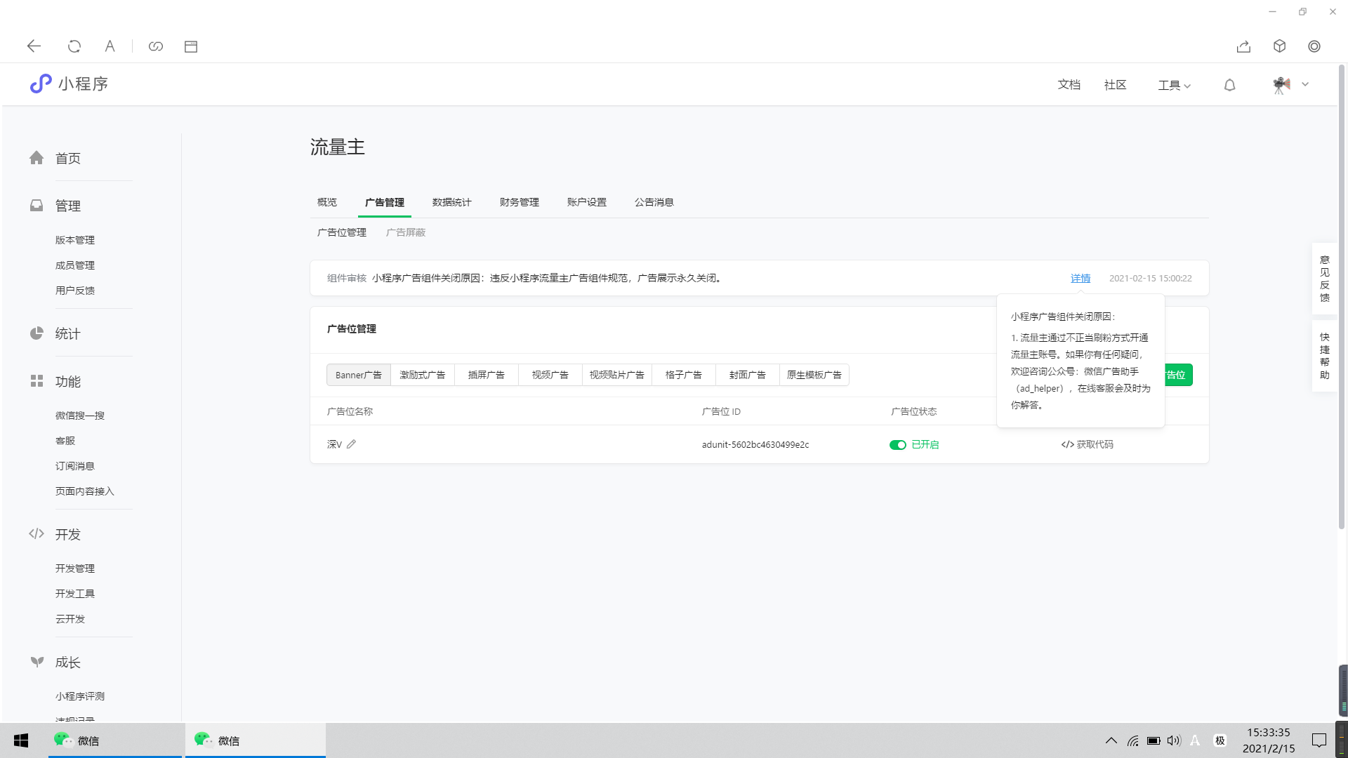 为什么把我小程序的广告永久关闭了?说我用不正当的方式开通流量主,我真的笑了,我小程序搭建好后都是认真推广开通的?请给我个合理的解释?你们是如何判定的?花了半个月推广的就这么给我封了?