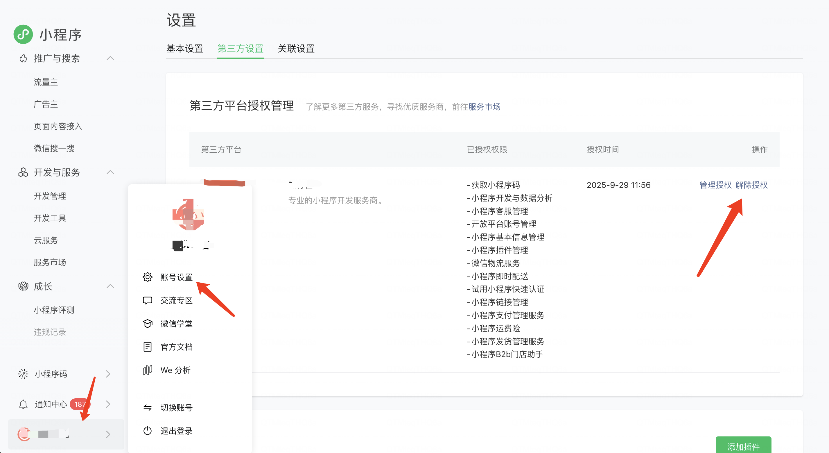 开发者或商家解绑开发小程序或解除授权第三方平台:登录https://developers.weixin.qq.com/platform/,解绑开发小程序/解除授权:选择对应小程序/账号(公众号等)-->[更多关系详情]-->绑定关系页面【管理绑定】或授权关系页面【管理授权】,若非管理员操作,需要管理员扫码确认