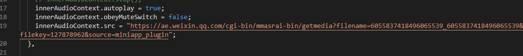 const app = getApp()const innerAudioContext = wx.createInnerAudioContext()Page({data: {},onLoad:function() {this.initReadPlugin();},testread:function(){debugger// innerAudioContext.stop();innerAudioContext.autoplay =true;innerAudioContext.obeyMuteSwitch =false;innerAudioContext.src ="https://ae.weixin.qq.com/cgi-bin/mmasrai-bin/getmedia?filename=6055837418496065539_6055837418496065539&filekey=127878962&source=miniapp_plugin";},initReadPlugin:function() {//初始化,播放插件innerAudioContext.onWaiting(() => {debugger});innerAudioContext.onCanplay(() => {debugger});innerAudioContext.onPlay(() => {debugger});innerAudioContext.onPause(() => {debugger});innerAudioContext.onEnded(() => {debugger});innerAudioContext.onError((res) => {debugger})},})不知道代码片段的使用方式对不对,所以,把关键代码拿出来了。