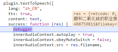 "plugins": {"WechatSI": {"version":"0.2.0","provider":"wx069ba97219f66d99"}}plugin.textToSpeech({lang:"zh_CN",tts:true,content: text,success:function(res) {debuggerconsole.log("success");innerAudioContext.autoplay =true;// innerAudioContext.obeyMuteSwitch = false;innerAudioContext.src = res.filename;这个问题解决没,兄弟