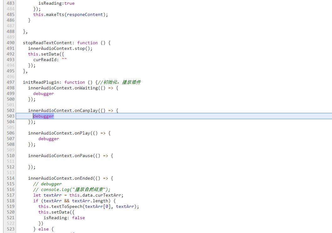 initReadPlugin: function () {//初始化,播放插件innerAudioContext.onWaiting(() => {debugger});innerAudioContext.onCanplay(() => {debugger});innerAudioContext.onPlay(() => {debugger});innerAudioContext.onPause(() => {});innerAudioContext.onEnded(() => {// debugger// console.log("播放自然结束");});innerAudioContext.onError((res) => {})},//filename 为 语音合成插件了返回的地址,经测试是正常的 innerAudioContext.autoplay = true innerAudioContext.src = res.filename; |