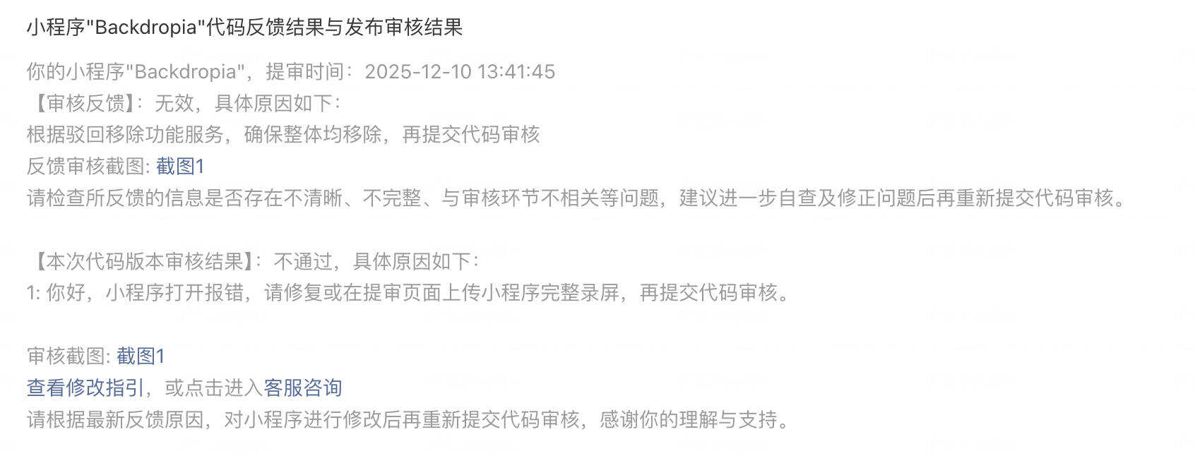 你好,经核实,目前小程序最新版本打开仍存在报错,建议自行排查修复,整改后再提审,审核将以实际版本内容为准。