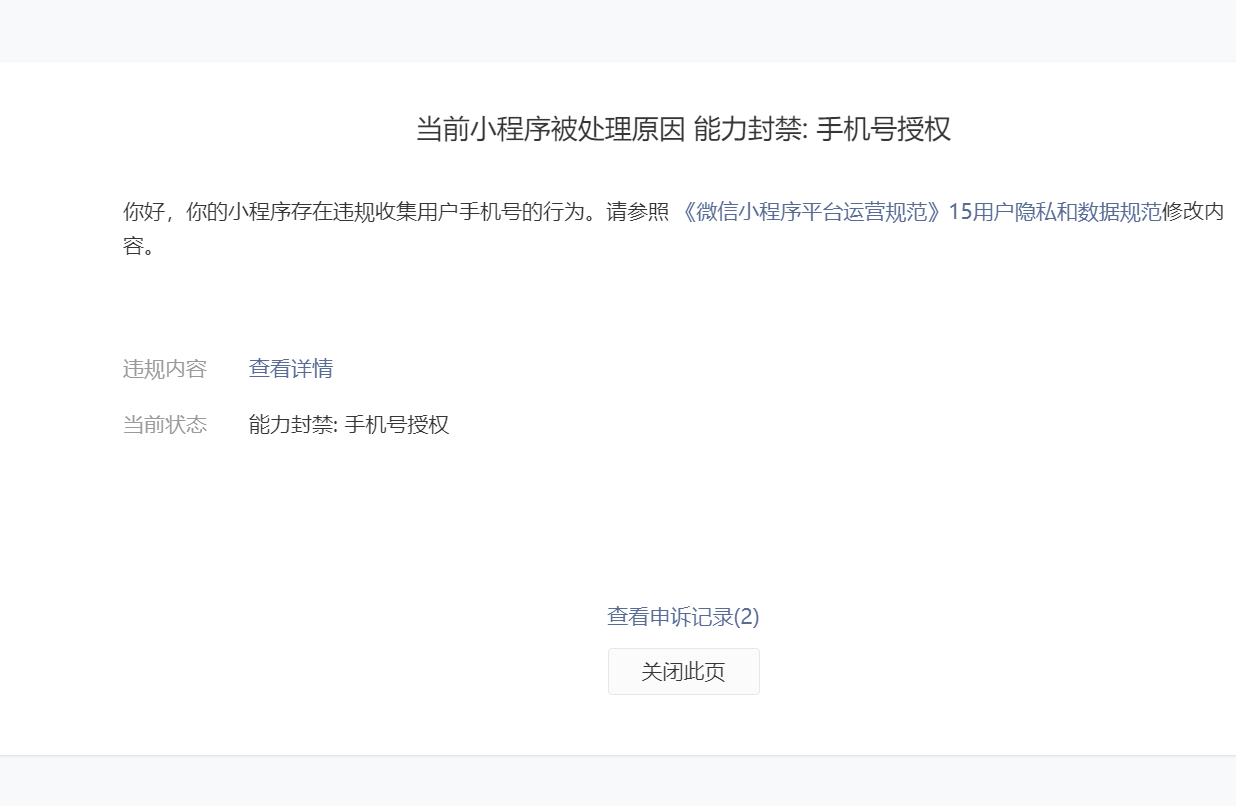 小程序显示“存在违规收集用户手机号的行为”,手机号功能已经被禁。