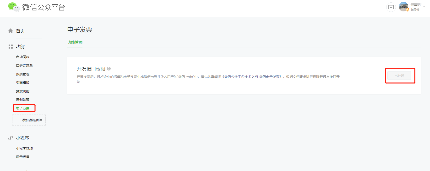 进入公众平台->添加功能插件->电子发票功能->申请开通。