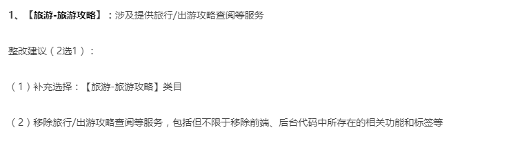 代码审核环节,将会对小程序运营的内容与所选类目是否相符进行核实,当小程序涉及提供旅行/出游攻略查阅等服务时,根据服务内容需要补充对应的旅游-旅游攻略类目,否则代码审核环节将面临因类目不符被驳回情形。