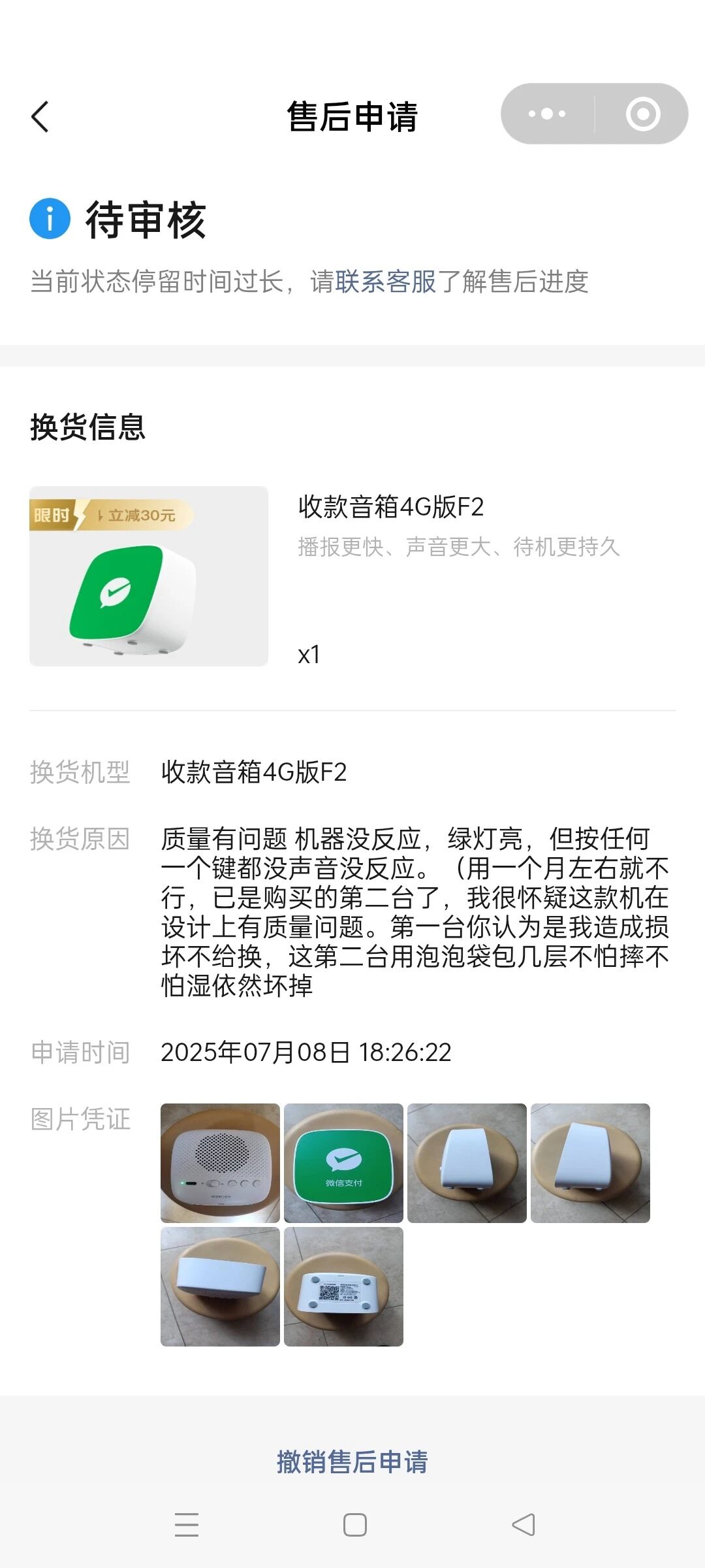 投诉:你们出品的音箱质量太差,售后服务更差!下单前看到商品描述上写的是12个月内出现故障免费维修,第一台购买后使用4个月就坏了,你们不给换也不给修,我只好重新买第二台,第二台更离谱,居然用1个月就坏,申请售后,过了半个月超过审核期都无人处理。(你们那么大型的公司,质量、服务、效率都那么差,你们好意思吗) 如果你们认为是我不会用、使用不当造成坏机,那为什么我用S1用了四五年都不会坏,最后是被你们关停了才无法用,F2却买了两次都总在短期内坏机?分明是这款机设计有问题或安装的机件质量差。