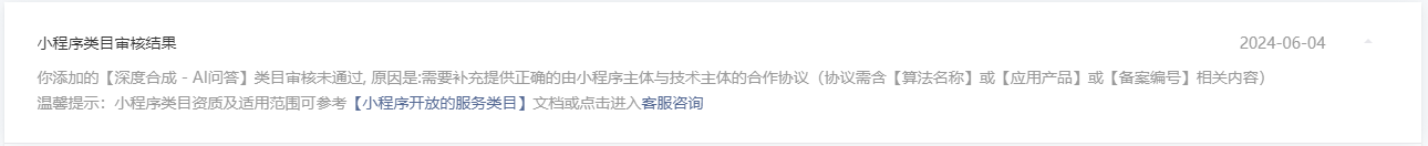 你好,经核实,小程序【wx4cb009d542cf787d】申请【深度合成-AI问答】类目,提交的《合作协议》非小程序主体与技术主体签订的,建议提供小程序主体与技术主体签订的《合作协议》(内容需包含【算法名称】或【应用产品】或【备案编号】相关内容),暂无协议模板。