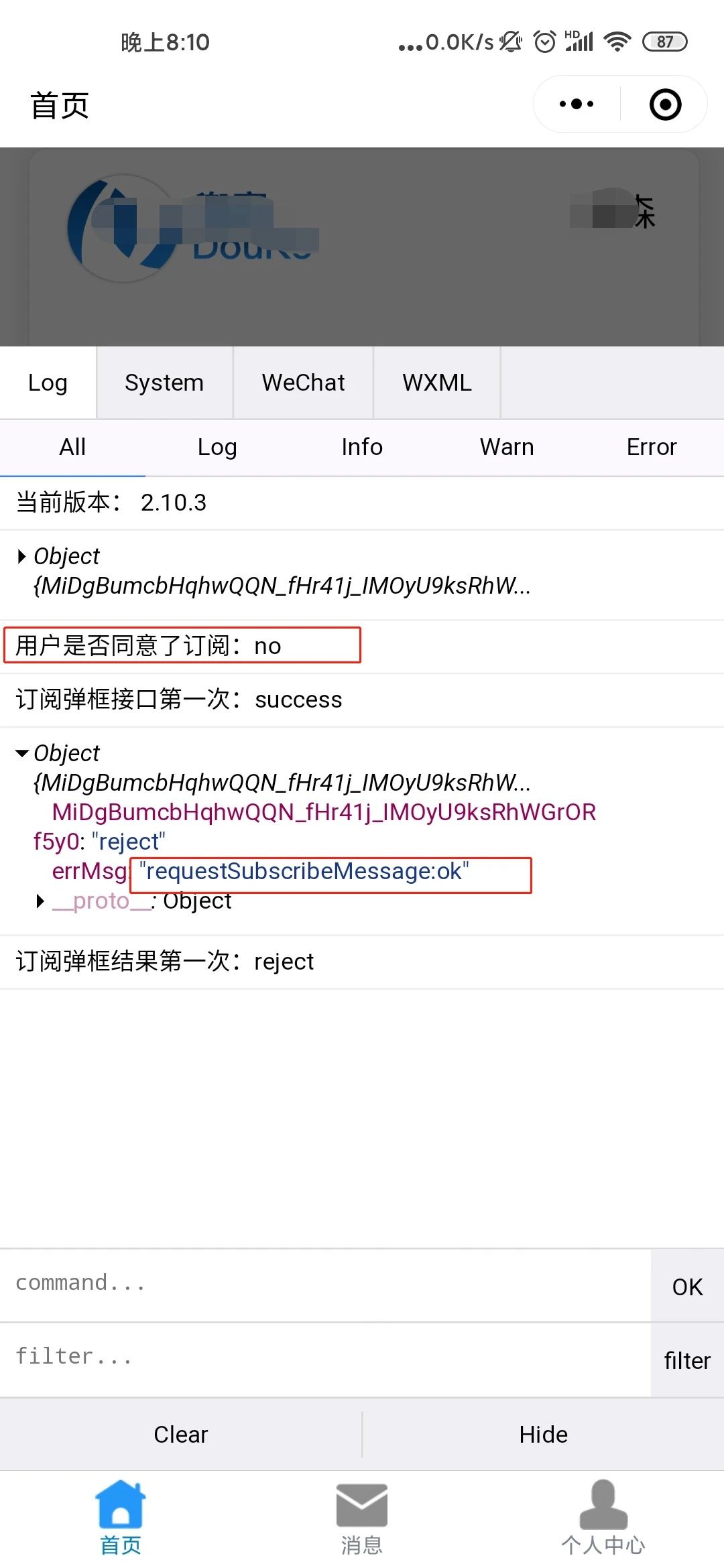 2.总开关开启,消息模板未选中状态(如图),requestSubscribeMessage无法弹框,但errMsg却返参ok,且默认选了拒绝(如图2,订阅弹框结果第一次:reject),实际并没有弹框,为什么?