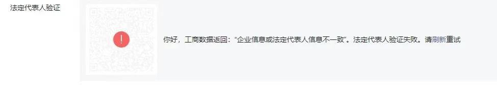 你好,核查发现填写的主体名称与营业执照上的主体名称不一致,故法人验证失败。请严格按照营业执照的主体名称填写。