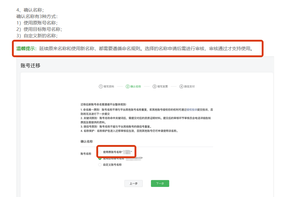 【新注册的订阅号名称是否可以与原服务号同名】新注册的订阅号注册时可以随便取个可以通过的名称,再在账号迁移步骤选择【使用原服务号名称】。