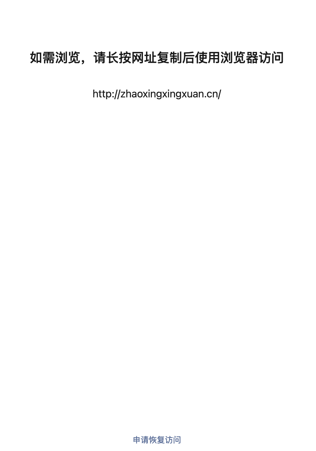 https://zhaoxingxingxuan.cn/,域名并未违规,但是在微信内访问被拦截,需要能恢复直接访问,解除拦截限制