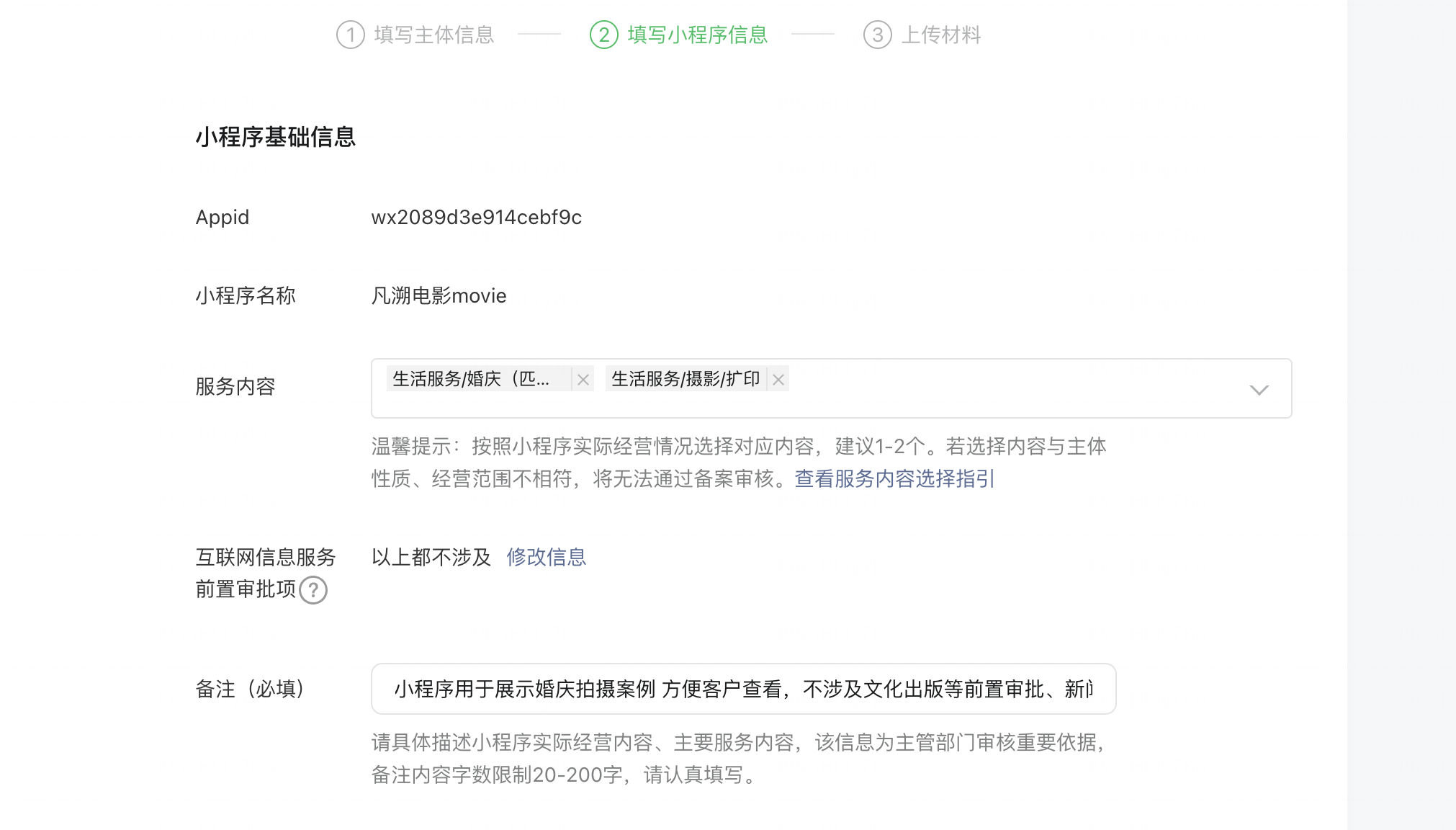 小程序用于展示婚庆拍摄案例 方便客户查看,不涉及文化出版等前置审批、新闻、金融、宗教、医疗器械、网约车、校外培训、广播电影电视节目、