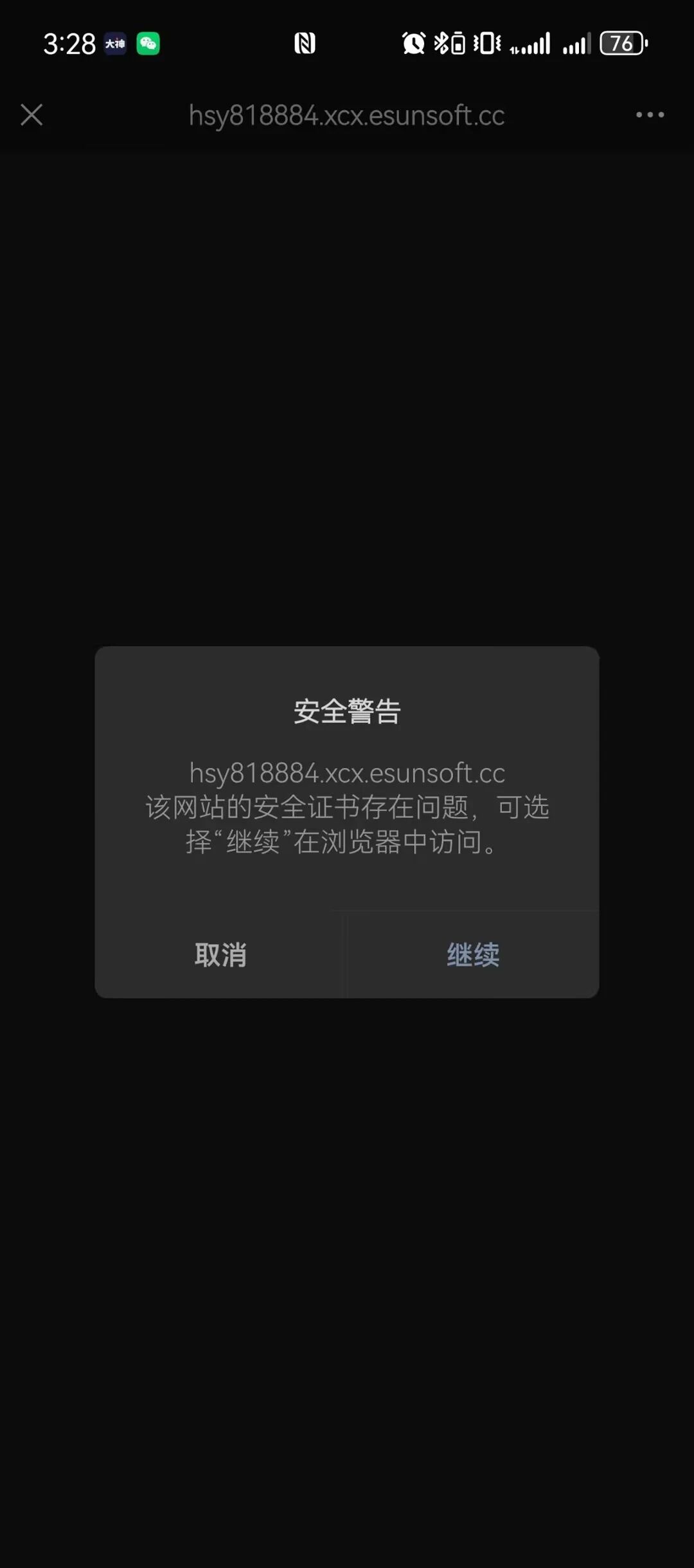 可能验证是域名地址https://hsy818884.xcx.esunsoft.cc,提示有问题的也是这个,需要确保这个官网能正常访问