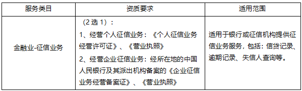 【金融业-征信业务】类目:适用于提供银行或征信机构提供征信业务服务,包括但不限于:信贷记录、逾期记录、失信人查询等服务。