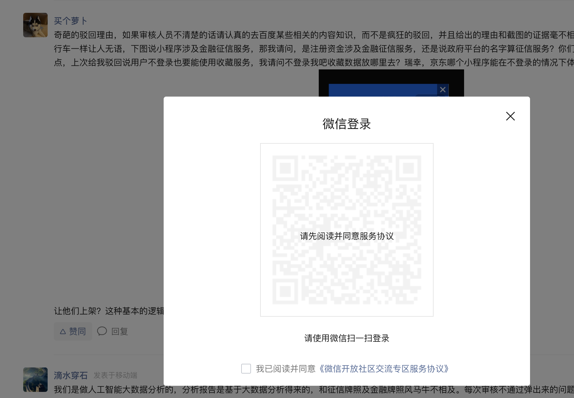 奇葩的驳回理由,如果审核人员不清楚的话请认真的去百度某些相关的内容知识,而不是疯狂的驳回,并且给出的理由和截图的证据毫不相关,就像说鱼儿离不开自行车一样让人无语,下图说小程序涉及金融征信服务,那我请问,是注册资金涉及金融征信服务,还是说政府平台的名字算征信服务?你们的工作人员能不能正规一点,上次给我驳回说用户不登录也要能使用收藏服务,我请问不登录我吧收藏数据放哪里去?瑞幸,京东哪个小程序能在不登录的情况下体验购物车?为什么你们能让他们上架?这种基本的逻辑常识都理不清楚,能不能做好培训工作啊