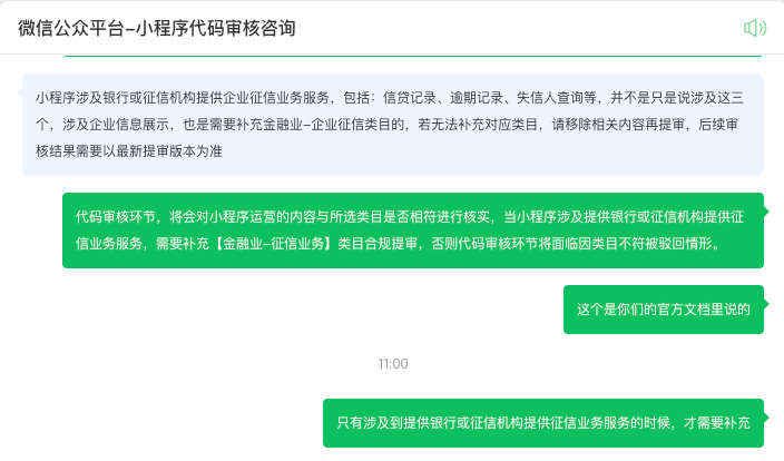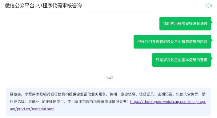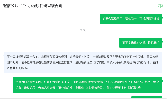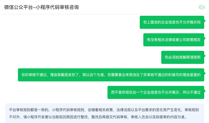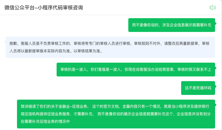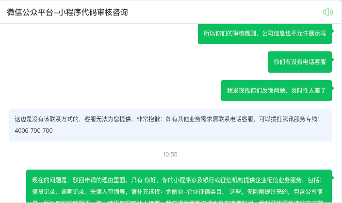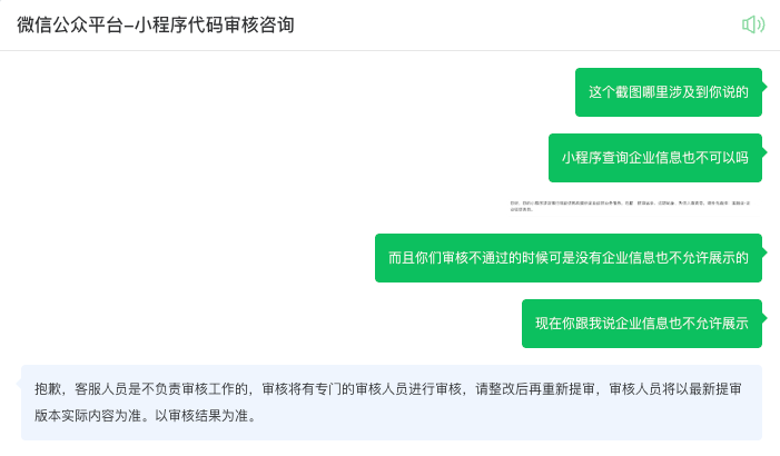 小程序主要涉及到企业基本信息的展示,但是审核卡住好几次了,找到客服,客服的不专业令我深感无奈和心累,具体聊天截图放出来,我现在找不到任何有效的反馈途径,打到官方的客服电话,电话里还是指引我找到公众平台的客服
