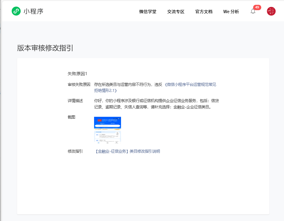 代码审核环节,将会对小程序运营的内容与所选类目是否相符进行核实,当小程序涉及提供银行或征信机构提供征信业务服务,需要补充【金融业-征信业务】类目合规提审,否则代码审核环节将面临因类目不符被驳回情形。