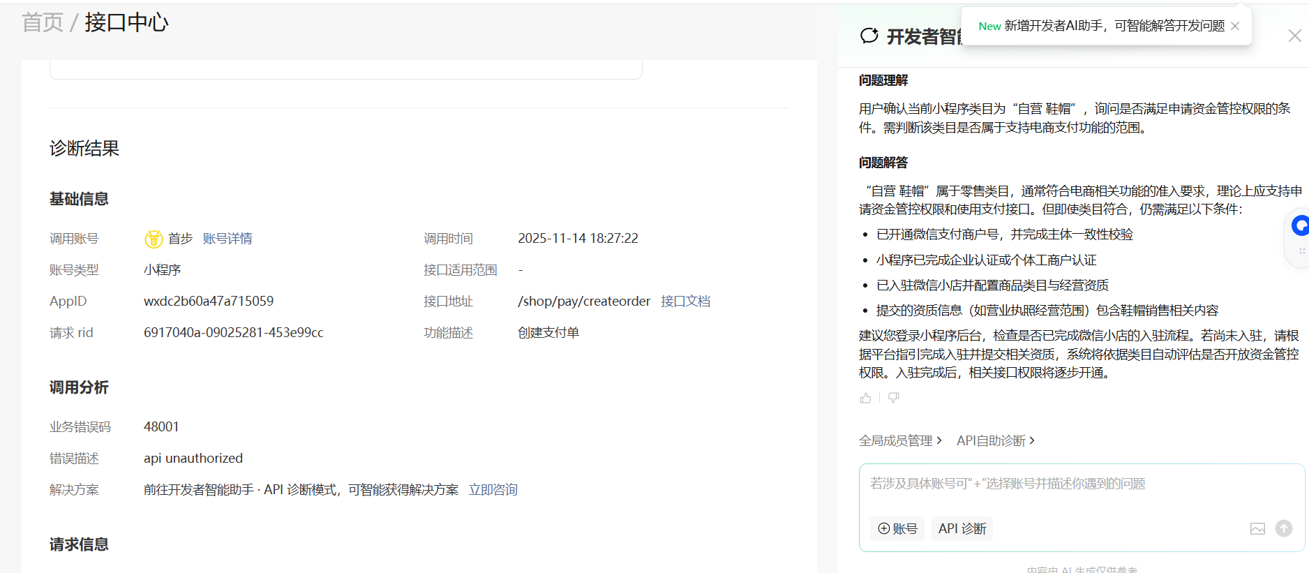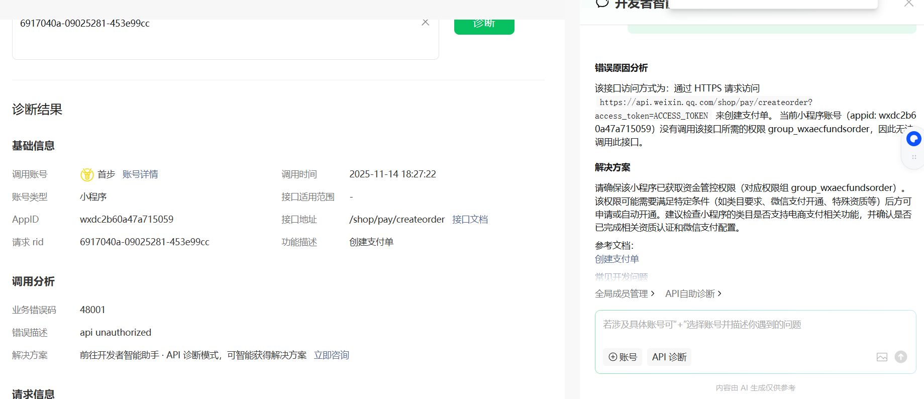 小程序支付返回错误:微信支付错误返回:api unauthorized rid: 69160d2d-57a4516e-72552ffe