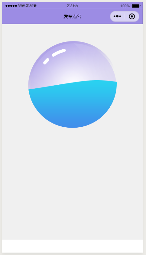 body{ /*position: flex;*/ width: 100%;height: 100%; /*overflow: hidden;*/}.ktdm-apply-takename{ width: 100%;height: 1150rpx; background-color: #F0F0F0; z-index: 1;}/*制作出球形div*/.ktdm-apply-takename-time{ width: 474rpx;height: 474rpx; margin: 0 auto; position:relative; border-radius: 50%; top: 80rpx; overflow: hidden; text-align: center;}/*水球图片*/.apply-time-image{ width: 495rpx;height: 495rpx;}.ktdm-apply-takename-blq{ width: 500rpx;height: 500rpx; position: relative; left: -14rpx; text-align: center;}.apply-time-water{ width: 500rpx;height: 500rpx; border-radius: 50%; position:relative; top: -250rpx; /*background-color: red;*/}.apply-time-water-png{ width: 2100rpx;height: 300rpx; position: absolute; top: -30rpx; right: 0; animation: apply-time-water-png 6.2s linear infinite;}@keyframes apply-time-water-png{ from {transform: translateX(-15rpx);} to {transform: translatex(925rpx);}} |
