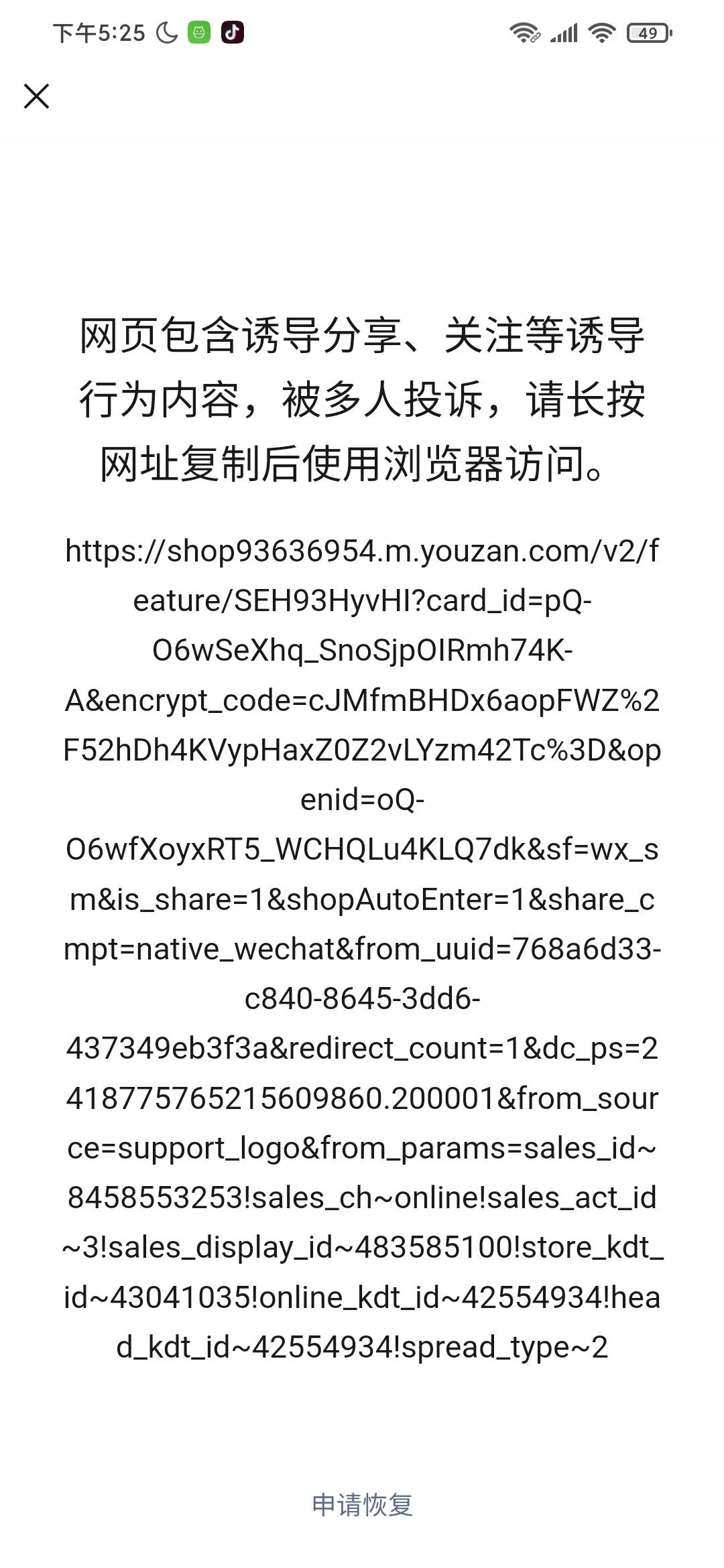 你好,经核实域名youzan.com下的链接【https://shop93636954.m.youzan.com/v2/feature/SEH93HyvHI?card_id=pQ-O6wSeXhq_SnoSjpOIRmh74K-A&encrypt_code=cJMfmBHDx6aopFWZ%2F52hDke41tTn%2B62V6IqiymWImZg%3D&openid=oQ-O6wd7_EPO2Egsbs796bgjQXfQ&sf=qq_sm&is_share=1&shopAutoEnter=1&share_cmpt=native_wechat&dc_ps=2418775765215609860.200001&from_source=support_logo&from_params=sl~MThX3S!online_kdt_id~43268757&from_uuid=03211d0c-ac39-bc46-b4fe-ad128f26b1ec】违规内容已经修改,现已恢复微信内直接访问的服务,请知悉。