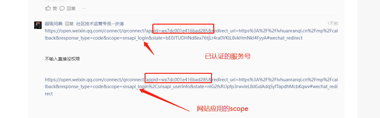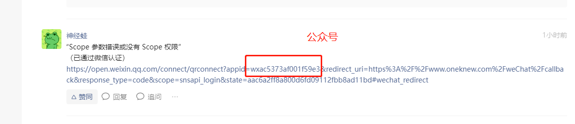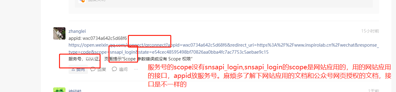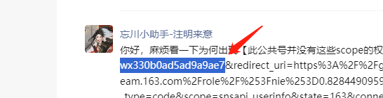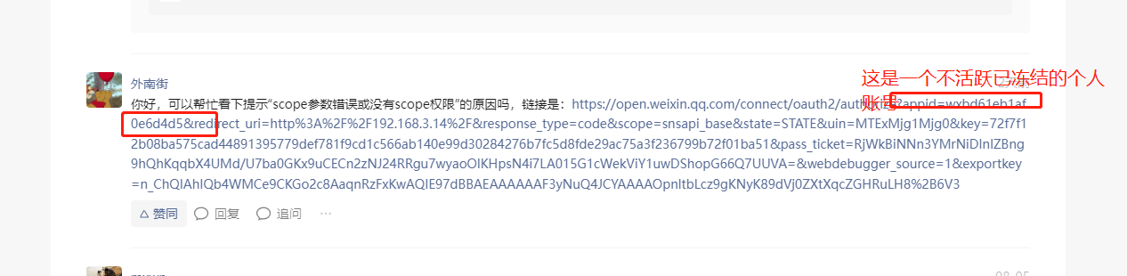 你好,可以帮忙看下提示“scope参数错误或没有scope权限”的原因吗,链接是:https://open.weixin.qq.com/connect/oauth2/authorize?appid=wxbd61eb1af0e6d4d5&redirect_uri=http%3A%2F%2F192.168.3.14%2F&response_type=code&scope=snsapi_base&state=STATE&uin=MTExMjg1Mjg0&key=72f7f12b08ba575cad44891395779def781f9cd1c566ab140e99d30284276b7fc5d8fde29ac75a3f236799b72f01ba51&pass_ticket=RjWkBiNNn3YMrNiDInlZBng9hQhKqqbX4UMd/U7ba0GKx9uCECn2zNJ24RRgu7wyaoOlKHpsN4i7LA015G1cWekViY1uwDShopG66Q7UUVA=&webdebugger_source=1&exportkey=n_ChQIAhIQb4WMCe9CKGo2c8AaqnRzFxKwAQIE97dBBAEAAAAAAF3yNuQ4JCYAAAAOpnltbLcz9gKNyK89dVj0ZXtXqcZGHRuLH8%2B6V3