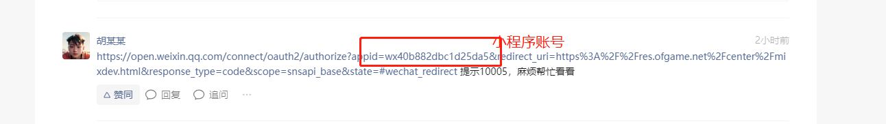https://open.weixin.qq.com/connect/oauth2/authorize?appid=wx40b882dbc1d25da5&redirect_uri=https%3A%2F%2Fres.ofgame.net%2Fcenter%2Fmixdev.html&response_type=code&scope=snsapi_base&state=#wechat_redirect 提示10005,麻烦帮忙看看