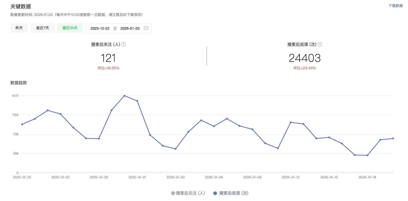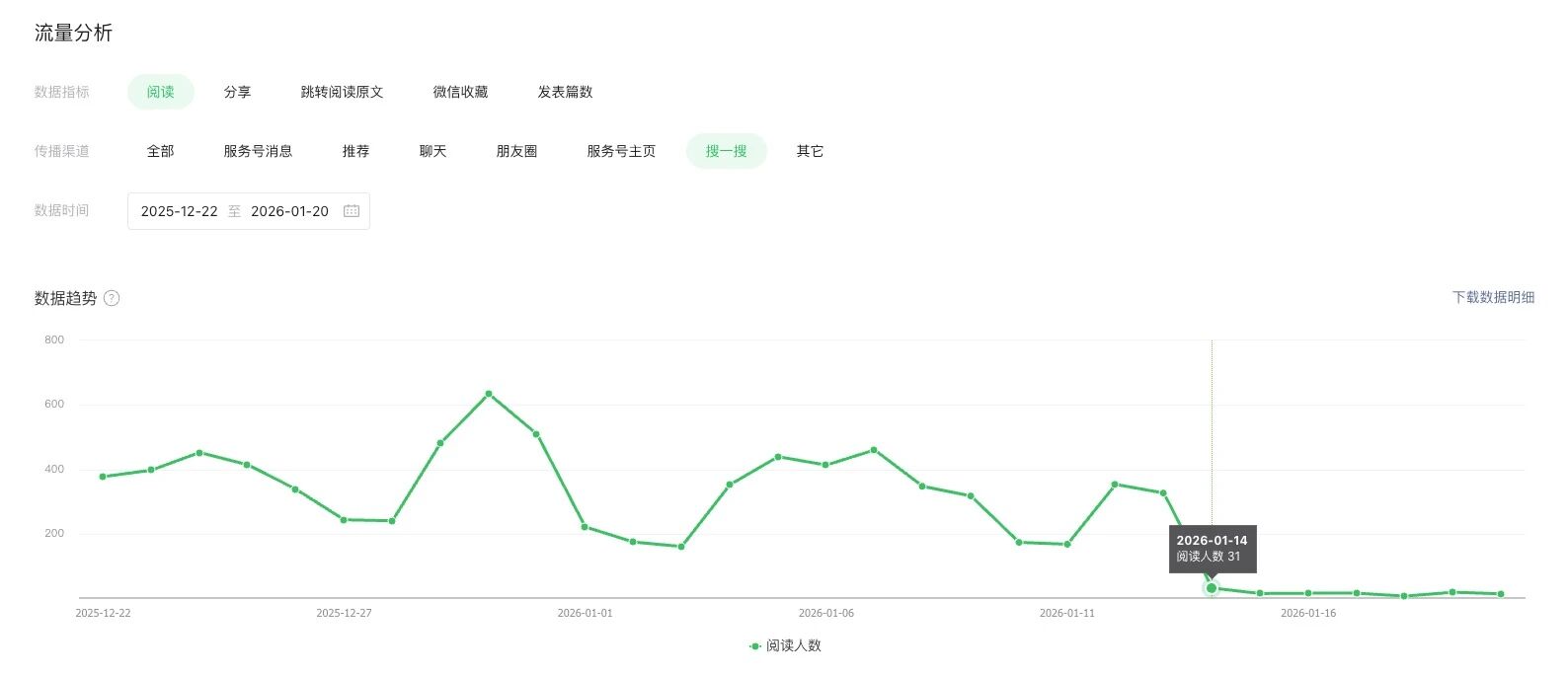 公众号ID:gh_1ce1973c85fe 在1月13日,文章搜索数据突然从每日几百下滑至每日十几个。但是后台有2处数据不一样,这里需要官方人员出来解释一下: 图一:后台-数据分析-内容分析,展示的【搜一搜】数据,从1月14日直接断崖式下滑 图二:后台-广告与服务-微信搜一搜-数据中心,展示的数据并未有什么太大影响