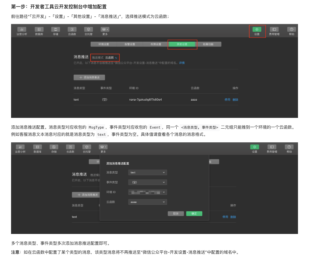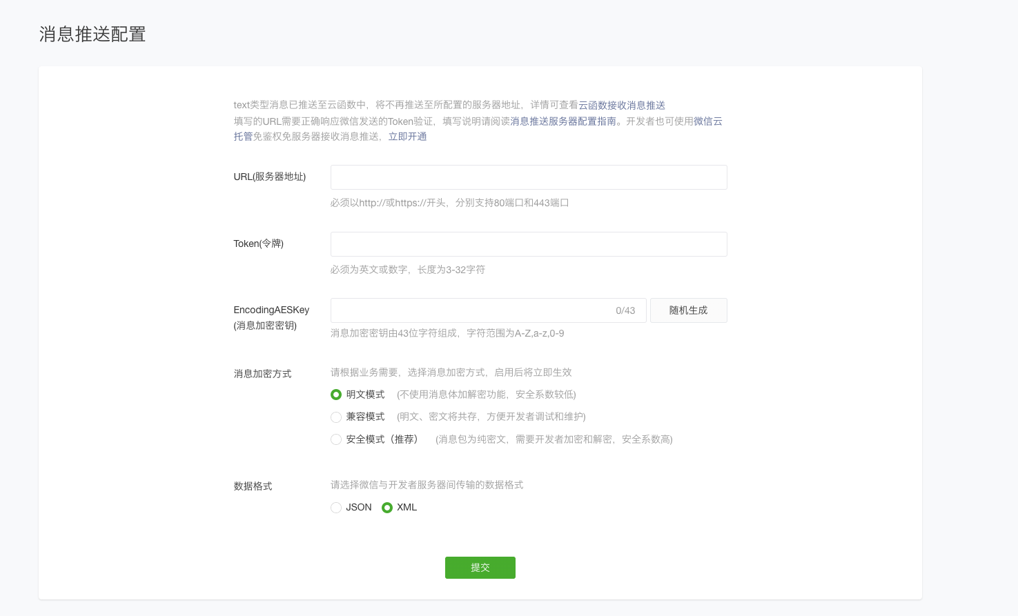 然后我打开文档一看,按着步骤https://developers.weixin.qq.com/miniprogram/dev/framework/server-ability/message-push.html操作了,but没有看到有直接的token aes啥的,是要在这个云函数里面自己写认证嘛,