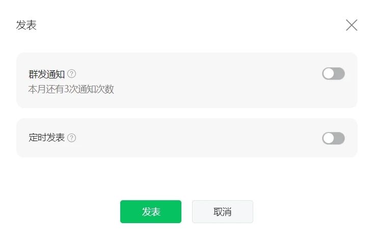 以前公众号发布文章有“发表”和“发布”两种模式,十分方便,现在没有文章发布时,只有”发表”没有发布了,请问腾旭的技术,你们是是不是闲得?画蛇添足,原来的功能多好用啊!你说现在“发布”和发表成一体了, 把群发关了就是原来的“发布”,但这很容易产生歧义啊,我关了群发了,也是提示我还有几次通知次数,让管理者不敢轻易点发表,你好好的发布按键为啥非要去掉呢,难道是,没活干就不给你们开工资和绩效吗?