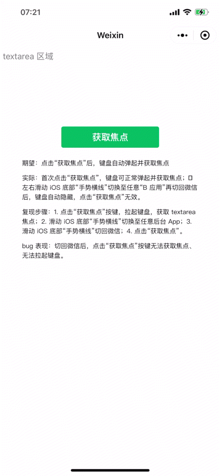 【复现步骤】1. 点击“获取焦点”按键,拉起键盘,获取 textarea 焦点;2. 滑动 iOS 底部“手势横线”切换至任意后台 App;3. 滑动 iOS 底部“手势横线”切回微信;4. 点击“获取焦点”。