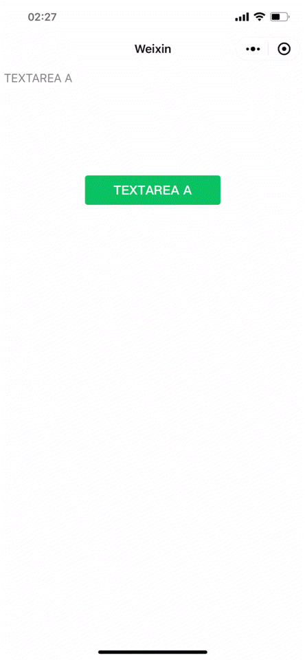 1. 此处有一个 bug,倘若在未手动点击 textarea 触发聚焦前,设置 focus 为 true(此时仍无法拉起键盘),之后手动点击 textarea 主动触发聚焦,然后再触发失焦,小程序会再默认触发一次聚焦并拉起键盘,bug 演示:https://mmbiz.qpic.cn/mmbiz_gif/7XEHmpfVlbicaTotibeKZFx8PxRIfV0LC8WadMbPdqiakeDx9tia06bkbicKDEYkRgqrHr3Siapvmic7tx7wXAYsibhbicw/0?wx_fmt=gif,代码片段:https://developers.weixin.qq.com/s/H9vv4XmC73xD。