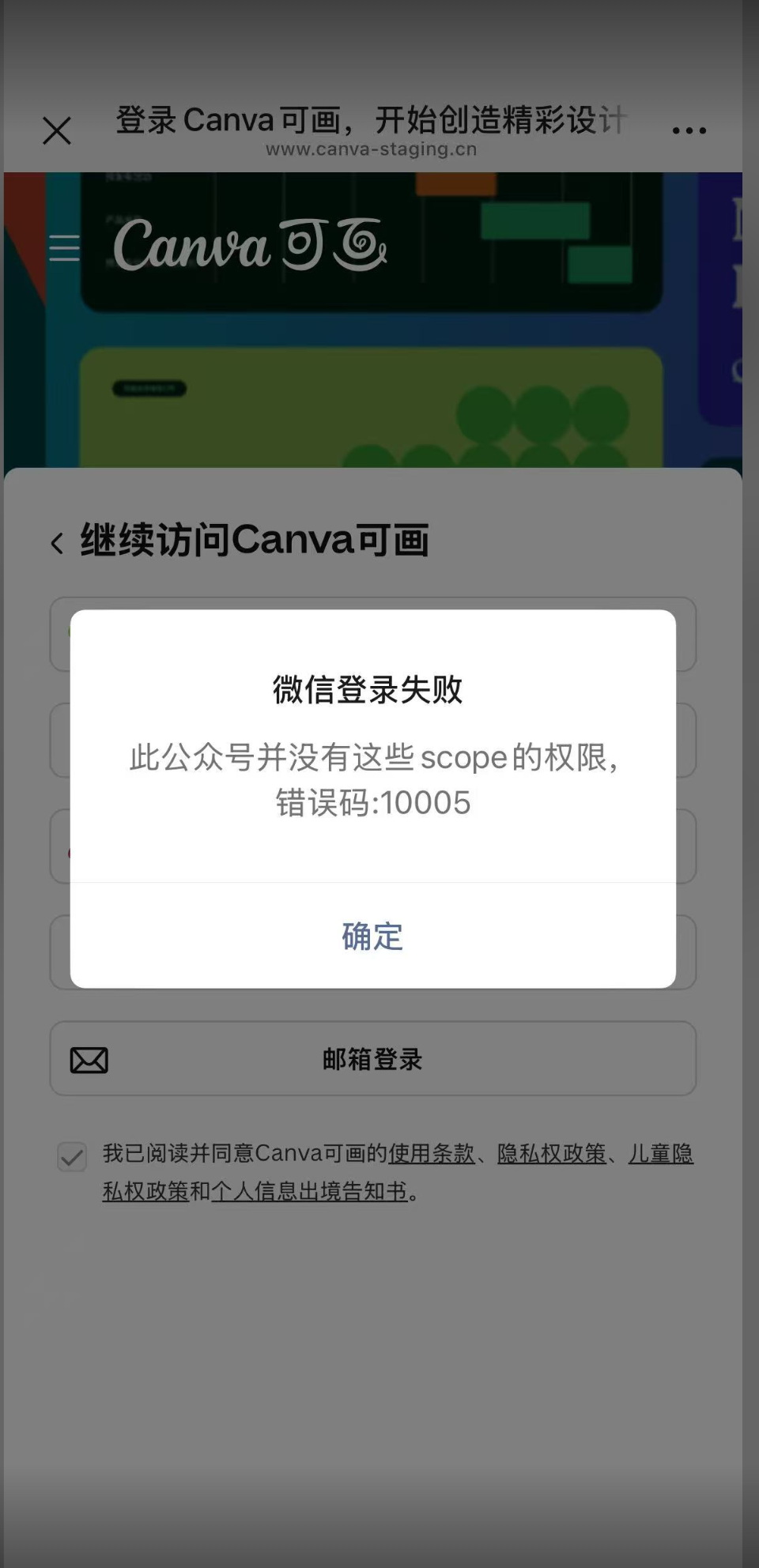 你好,我是可画(canva)的开发者。我希望在微信内置浏览器实现用户登陆,但是测试发现报错,请问如何解决呢?