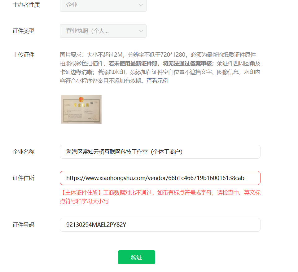 微信官方平台小程序备案时没有明确说明,电商网址无法作为“证件住所”地址,且提示"【主体证件住所】工商数据对比不通过,如带有标点符号或字母,请检查中、英文标点符号和字母大小写"无任何说明,且没有客服可以联系,实在很不合理,官方并没有任何明确的解决方案去提供给大家。@小程序运营专员-PZY