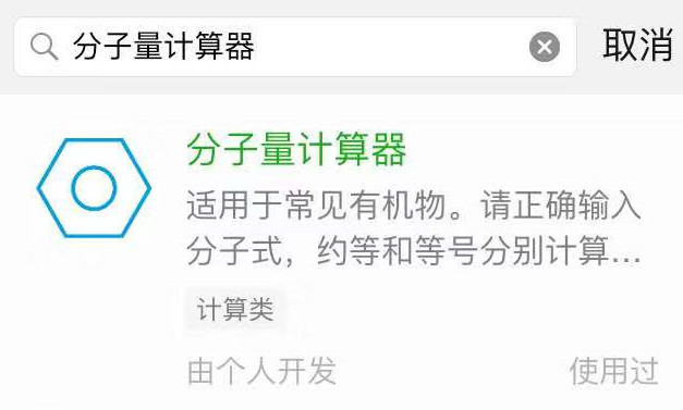 在微信发现页-小程序,输入“分子量计算器”,搜索结果中第一条(计算类小程序)。