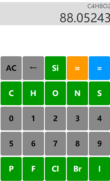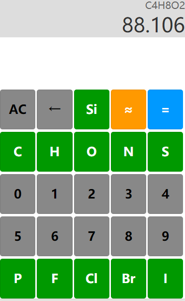 通过键盘输入分子式,如乙酸乙酯分子式为C4H8O2,依次点击’C’-’4’-’H’-’8’-’O’-’2’,然后点击‘≈’(即约等号),即可得到该化合物的相对分子量。结果为88.106。