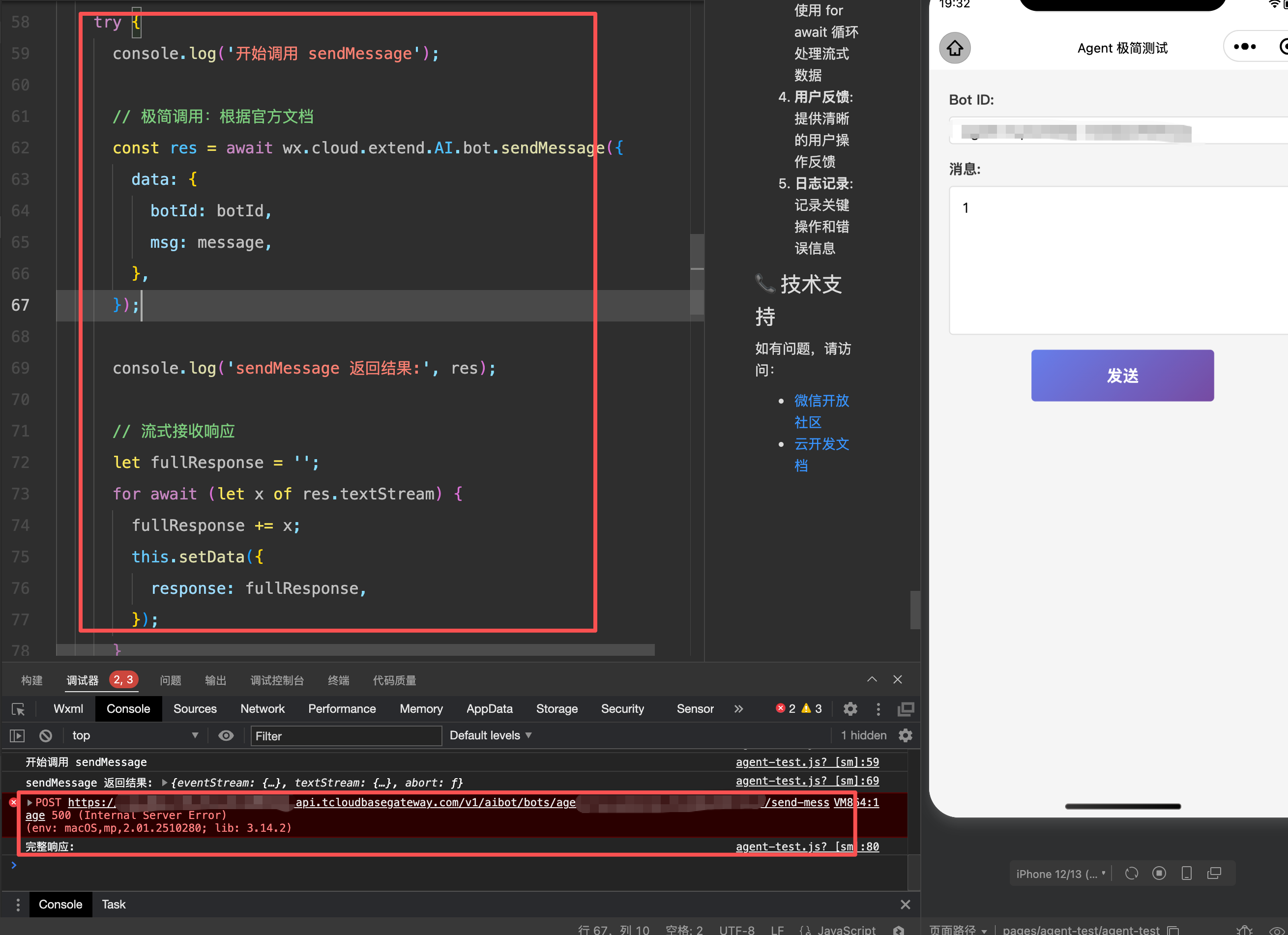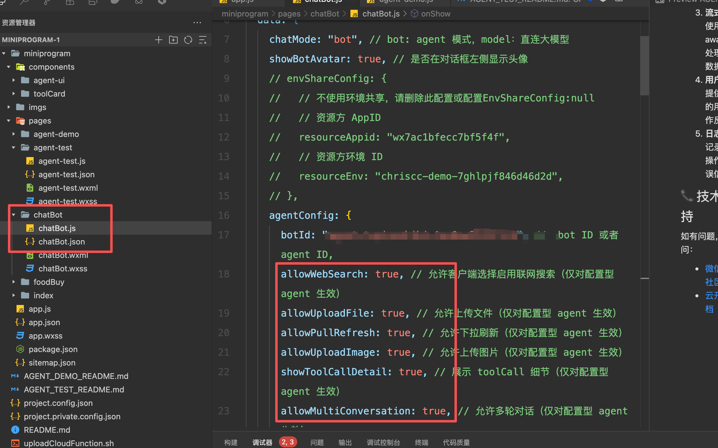 问题1:已经按https://developers.weixin.qq.com/miniprogram/dev/wxcloudservice/wxcloud/reference-sdk-api/extend/ai.html#AI-bot-sendMessage这个文档处理了,之前文字能调通;