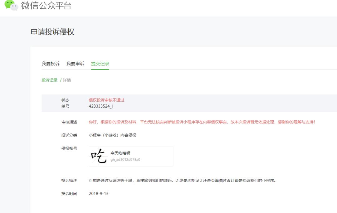 我们的小程序“你要去吃啥”被“今天吃啥呀”小程序在功能上和设计上抄袭,严重侵权。我们也积极的通过官方投诉渠道进行了投诉,但是结果“投诉审核不通过”。