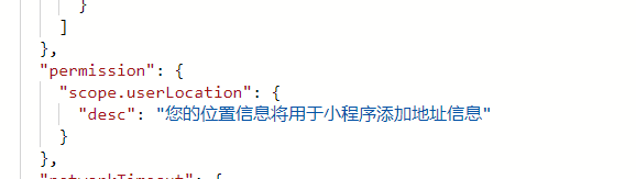"permission": { "scope.userLocation": { "desc": "你的位置信息将用于小程序位置接口的效果展示" } } |